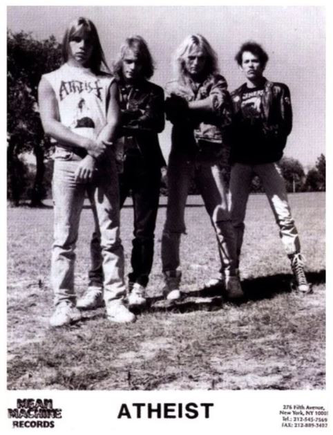 ex Lee Harrison, Jonathan Thompson, Josh Greenbaum, Tony Choy, Rand Burkey, Roger Patterson, Frank Emmi, Sonny Carson, Chris Baker, Sean Martinez, Travis Morgan Atheist are a US technical death metal band from Sarasota, Florida. The band is known for its highly complex playing and for incorporating jazz and Latin elements into their sound. They were initially founded in 1984 under then name Oblivion, which was soon changed to R.A.V.A.G.E. (Raging Atheist Vowing A Gory End). The band issued several demos under this name before shortening their moniker to just Atheist. The band released their first album, Piece Of Time in 1989. The line-up was Kelly Shaefer (vocals, guitar), Rand Burkey (guitar), Roger Patterson (bass), and Steve Flynn (drums). In 1991, as the band was preparing their follow up, Patterson was killed in a car accident. He was replaced by Tony Choy (