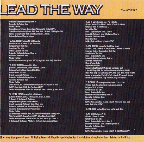 tracks 3, 7, 11, 13, 16 backing vocals Dionne Jackson tracks 12, 13, 16 backing vocals Otis & Shugg executive-producer, producer, drums, keyboards Ant Banks tracks 6, 8, 11 to 13, 16, 17, 19 guitar James "Tre" Rabb mastered by Marc Regan presenter Ant Banks producer Sonny B Copyright (c) Thump Records, Inc. Phonographic Copyright (p) Thump Records, Inc. Manufactured By Thump Records, Inc. Distributed By Universal Music & Video Distribution Recorded At Platinum House Mixed At The Plant Studios Mixed At Platinum House Mixed At Fantasy Studios Mastered At Precision Mastering Pressed By CMCA This version has Parental Advisory Explicit Lyrics printed on the front cover.