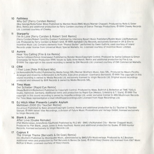 concept by, compiled by [compilation] Ashley Abram dj mix [mixed by] Richard Evans design The Design Corporation Record Company EMI Copyright (c) Virgin Records Ltd. Phonographic Copyright (p) Circa Records Ltd. Copyright (c) Circa Records Ltd. Mixed At Wise Buddah Music Studios Designed At The Design Corporation Marketed By Virgin Commercial Marketing Glass Mastered At EMI Swindon Printed in the E.U. Made in the E.U.
