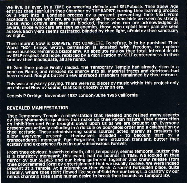cover Anno Dittmar liner notes Genesis P-Orridge liner notes Malik remastered by Manfred Schiek Recorded At Berlin Atonal Festival Remastered 1993. Temporary Temple was originally a Hyperdelic release in 1987 by Temple Records Limited in a limited edition ov 2300 copies on vinyl only. Nursery Times - Skinhead Moonstomp is a live recording of PTV at the Berlin Atonal Festival on Friday 2nd of December 1983.