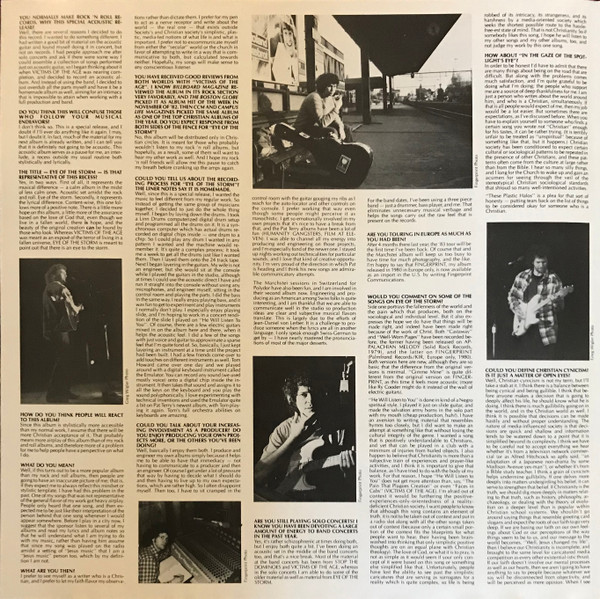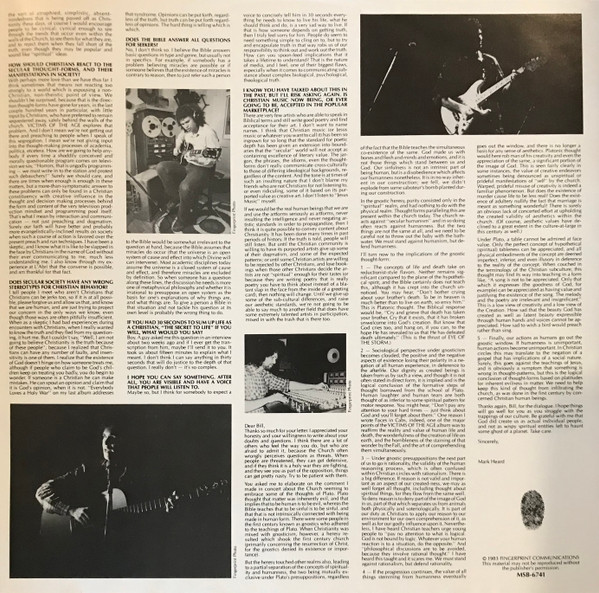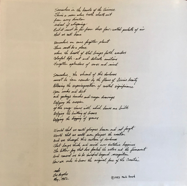 tracks a1-a3,b1 backing vocals Dave De Coup Crank tracks a1-a5,b1,b2,b5 backing vocals Mark Heard design [cover design], art direction Tim Alderson drums [linn drums], bass, acoustic guitar, electric guitar, lead guitar, slide guitar, accordion, mandolin, harmonica, xylophone, percussion, other [voicehorns, voicestrings] Mark Heard engineer [assistant], photography by Janet Sue Heard engineer, mixed by Mark Heard mastered by Steve Hall mastered by [assistant] Wally Grant pedal steel guitar Al Perkins producer Mark Heard saxophone Brandon Fields tracks a2, a3, a4, b1, b3, b4 synthesizer [emulator], electric piano [fender rhodes], synthesizer Tom Howard tracks a2, b1 synthesizer, electric piano [fender rhodes] Phil Madeira tambourine, shaker, other [toothbrush, bowling pins] Harry Stinson written-by, design [cover design], photography by Mark Heard Phonographic Copyright (p) Home Sweet Home Records, Inc. Copyright (c) Home Sweet Home Records, Inc. Published By Bug & Bear Music Recorded At Gold Mine Mastered At Future Disc Pressed By Monarch Record Mfg. Co. [l264380] pressing as denoted by 'MR' etched in runouts.