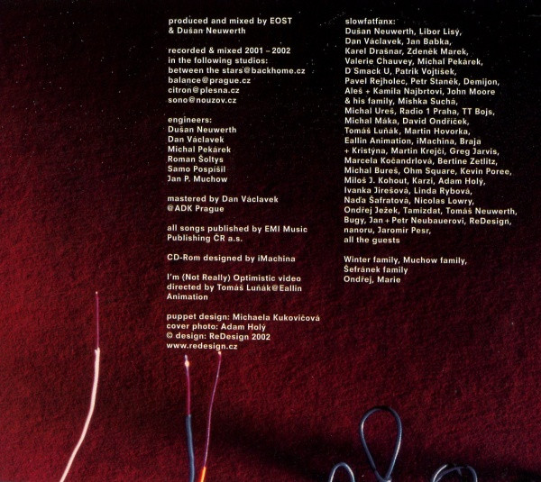 cover [photo] Adam Holý design ReDesign design [puppet] Michaela Kukovičová engineer Dušan Neuwerth engineer Jan P. Muchow engineer Michal Pekárek engineer Roman Šoltys engineer Samuel Pospíšil engineer, mastered by Daniel Václavek producer [produced], mixed by Dušan Neuwerth producer [produced], mixed by The Ecstasy Of Saint Theresa Phonographic Copyright (p) EMI Czech Republic s.r.o. Copyright (c) EMI Czech Republic s.r.o. Recorded At Between The Stars Recorded At Studio Balance Recorded At Studio Citron Recorded At Sono Studio Mixed At Between The Stars Mixed At Studio Balance Mixed At Studio Citron Mixed At Sono Studio Published By EMI Music Publishing Česká Republika a.s. Pressed By GZ Digital Media Marketed By EMI Distributed By EMI Recorded & mixed 2001 - 2002 in the following studios: between the stars@backhome.cz balance@prague.cz citron@plesna.cz sono@nouzov.cz