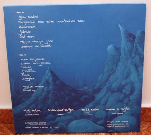 tracks a1, 4, b4 acoustic guitar Miloš Bešta tracks a2, 4 acoustic guitar Otakar Husák arranged by Asmodeus tracks a1, 3, 5, 6, b5, 7 backing vocals Miloš Bešta tracks a1, 3, 5, 6, b5, 7 backing vocals Otakar Husák tracks a1 to 7, b1 to 5, 7, 8 bass Tomáš Kocian cover Petr Tihelka tracks a1 to 7, b1 to 8 drums Daniel Vilášek engineer Tomáš Vráb tracks b7 guest, backing vocals Stanislav Svatoš tracks a1 to 3, b6 guest, clarinet Václav Štich tracks a7 guest, harmonica Ondřej Konrád tracks a1 to 4, 7, b4, 6, 7 guest, keyboards Tomáš Vráb tracks b4 guest, lead guitar Honza T.M.A. tracks a1, b2 lead guitar Miloš Bešta tracks a1-7,b1,3-5 lead guitar Otakar Husák tracks a1 to 3, 5 to 7, b1 to 3, 5, 7, 8 lead vocals Miloš Bešta photography by Martin Vilášek producer Petr Korál tracks a1 to 7, b1 to 5, 7, 8 rhythm guitar Miloš Bešta Pressed By GZ Digital Media Recorded At Propast Studio Phonographic Copyright (p) Magick Disk Musick Copyright (c) Magick Disk Musick Recorded 1.-7.5.1992 at Propast studio Mixed 7.-8.5.1992 Hand-numbered limited edition of 500 copies with a poster.