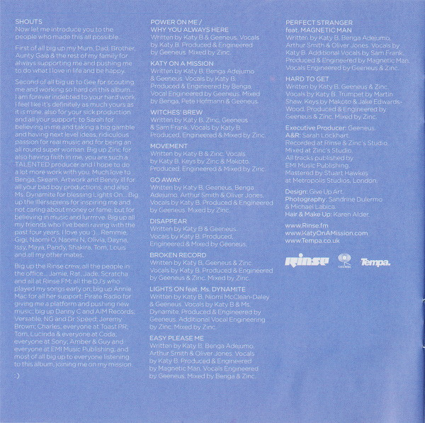 a&r Sarah Lockhart design Give Up Art executive-producer Geeneus hair, make-up [make up] Karen Alder mastered by Stuart Hawkes photography by Michael Labica photography by Sandrine Dulermo Phonographic Copyright (p) Ammunition Promotions Ltd. Copyright (c) Ammunition Promotions Ltd. Licensed To Sony Music Entertainment UK Limited Published By EMI Music Publishing Distributed By Sony Music Entertainment Recorded At Rinse Recorded At Zinc's Studio Mixed At Zinc's Studio Mastered At Metropolis Studios Glass Mastered At Sony DADC, Southwater Packaged in standard jewel case with clear CD tray. Includes 12-page booklet featuring lyrics. Tempa logo appears on page 10 of booklet only.
