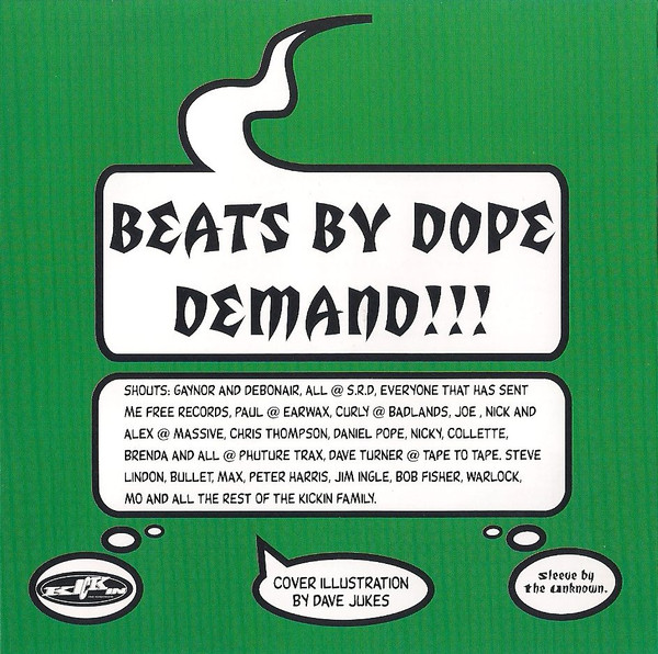 compiled by Slinky Merlinki illustration [cover illustration] Dave Jukes sleeve The Unknown Phonographic Copyright (p) Kickin Records Copyright (c) Kickin Records Pressed By SNA Distributed By SRD Title variations: Beats By Dope Demand!!! on the front cover, disc and last page of leaflet, Beats By Dope Demand on spines.