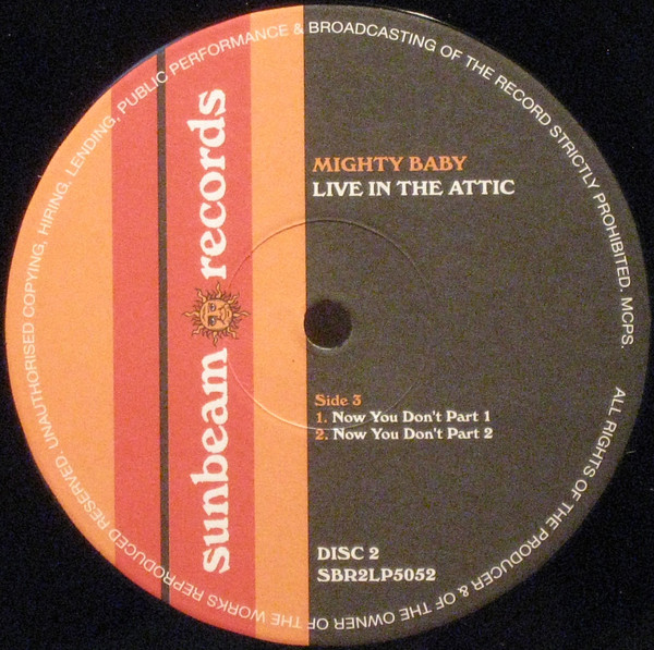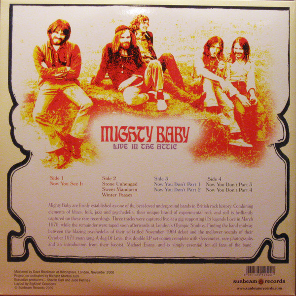 acoustic guitar [lead], electric guitar [lead] Martin Stone acoustic guitar [rhythm], electric guitar [rhythm], vocals Alan King bass, liner notes Mike Evans coordinator Richard Morton Jack drums, percussion, liner notes [interview] Roger Powell executive-producer Jude Holmes executive-producer Steven Carr keyboards, saxophone, flute, vocals Ian Whiteman layout BigKick! Creations mastered by David Blackman written-by Mighty Baby Copyright (c) Sunbeam Records Copyright (c) Rolled Gold Productions Recorded At Lanchester University Recorded At Olympic Studios Mastered At Hiltongrove Mastering Pressed By GZ Digital Media 180 gram virgin vinyl all-analogue audiophile pressing released in gatefold sleeve.