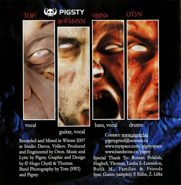 graphics, design Hugo Chytil graphics, design Thomas guest [spec. guests], sampler [samples] Pavel Kühn guest [spec. guests], sampler [samples] Zdeněk Liška music by, lyrics by Pigsty performer [pigsty], bass, vocals [vocal] u.b.i.n.a. performer [pigsty], drums OTyN performer [pigsty], guitar, vocals [vocal] BoRMaNN performer [pigsty], vocals [vocal] Topinka photography by [band photography by] Pigsty photography by [band photography by] Tom (SWI) producer, engineer Otyn Recorded At Davos Records Mixed At Davos Records Recorded and Mixed in Winted 2007 at Studio Davos, Vyskov.