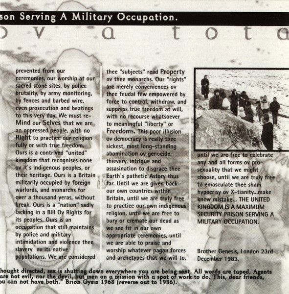design Room237 engineer Tryggvi Þór Herbertsson lead guitar Alex Fergusson performer Godkrist performer Grey Wolf performer Hilmar Örn Hilmarsson performer Thee TOPI Method photography by Lars Sundestrand producer Hilmar Örn Hilmarsson tape [prepared], drums John Gosling vocals, violin, bass [noise bass guitar] Genesis P-Orridge tracks 2, 8, 9, 11 written-by Alex Fergusson tracks 2, 4, 6 to 9, 11 to 14 written-by Genesis P-Orridge tracks 2, 4, 11 written-by Hilmar Örn Hilmarsson tracks 8 written-by Peter Christopherson Made By PDO, UK Limited to 1500 copies. Astru Naming Ritual for Caresse is intercut throughout thee CD between muzick tracks. [These are the untitled tracks below.] This music was thee fourth in a series ov 23 live recordings ov Psychick TV originally issued by Temple Records during thee 1980's. Thee First Will To And Testament Ov Psychick TV. All our works remain interconnected, interfaced, and intentional. Thee Process is thee Product. Additional Data Glut. This CD is deconstructed from recordings ov a live disconcert by Psychic TV in Reykjavik, Iceland that took place in November 1983 organised by HÖH and GRAMM Records, to whom, eternal and infernal thanks all ways. Engineered and produced in Reykjavik in 1984.