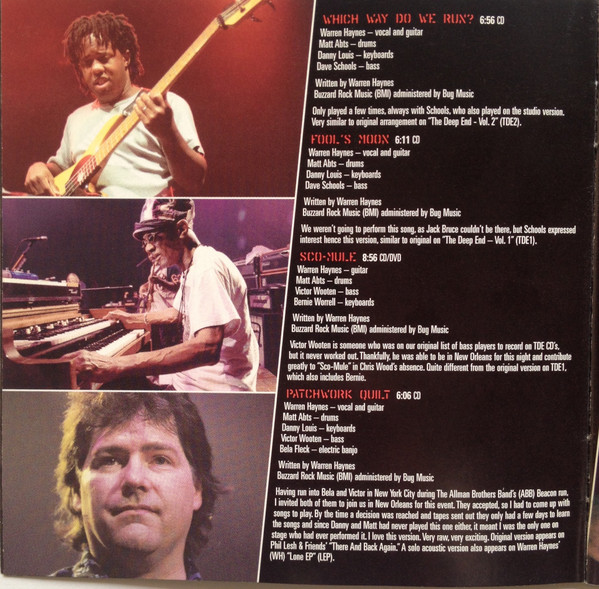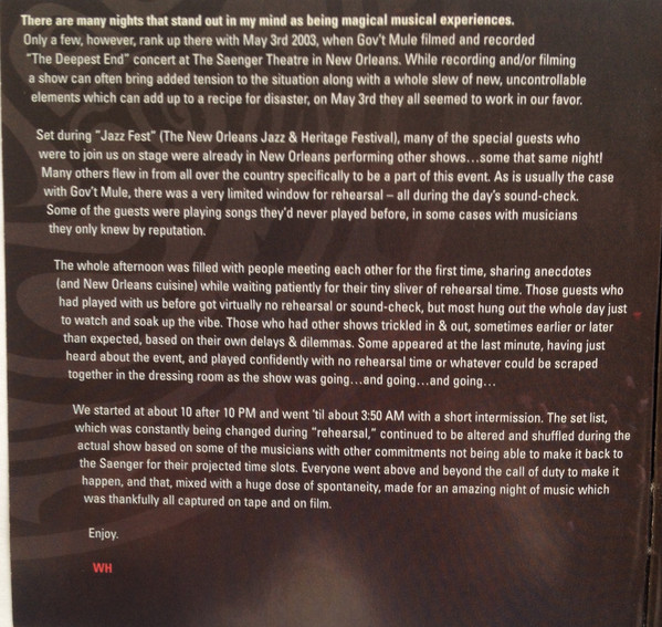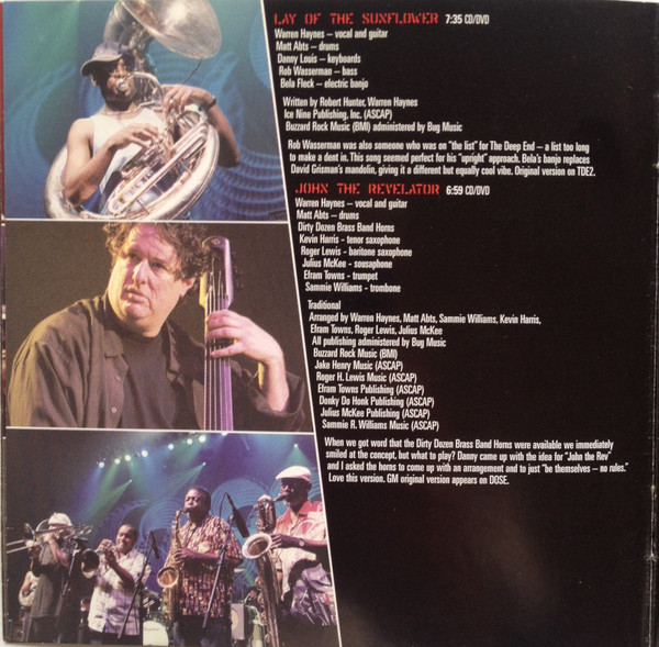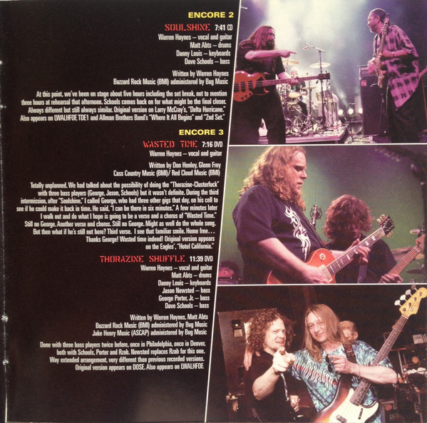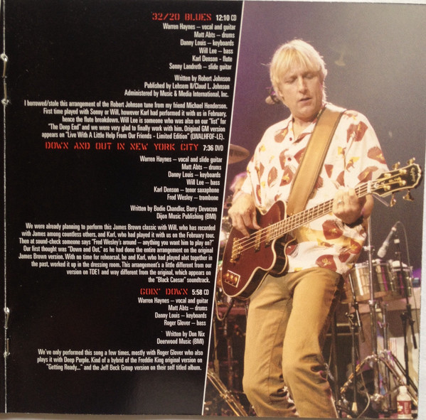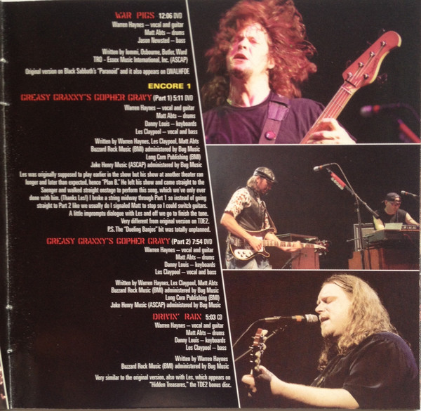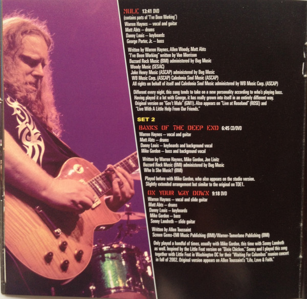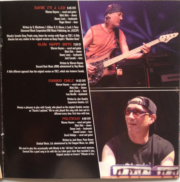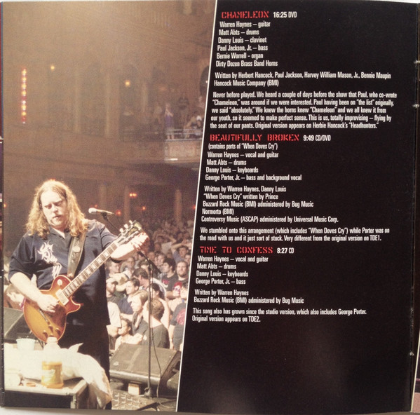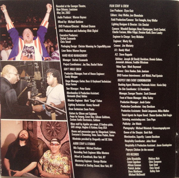 booking Kevin Daly booking Monterey Peninsula Artists coordinator [project coordinator management] Jay Baumgardner coordinator [project coordinator management] Rachel Reiter crew, engineer [monitor engineer] Mark "Sarge" Fulton crew, lighting director, lighting [design] Eric Sinclair crew, producer [line producer] Elyse Katz crew, producer [production assistant & merchandise] Hernando "Doe" Valdes crew, production manager, engineer [foh] Sandy Morgan crew, stage manager, technician [guitar, bass & keyboards tech] Brian Farmer crew, technician [drum tech] Sean Pretto crew, technician [lighting tech] Kenny Harwell crew, tour manager Peter Banta design [packaging] Christer Manning drums Matt Abts engineer [recording truck engineer] Mike Montero executive-producer Chris Tetzeli executive-producer Stefani Scamardo tracks dvd-1 to dvd-21 film producer, authoring Blink Digital tracks dvd-1 to dvd-21 film producer, film director Michael Drumm tracks cd1-1 to cd1-6, cd1-8 to cd1-9, cd2-1 to cd2-7, cd2-9 to cd2-10, dvd-1, dvd-2, dvd-4, dvd-7 to dvd-12, dvd-14, dvd-18, dvd-19, dvd-21 keyboards Danny Louis liner notes Warren Haynes management Hard Head Management management Stefani Scamardo mastered by George Marino mixed by Michael Barbiero photography by Michael Weintrob producer [audio produced by] Warren Haynes vocals, guitar Warren Haynes Phonographic Copyright (p) ATO Records, LLC Copyright (c) ATO Records, LLC Copyright (c) Evangeline Recorded Works Ltd. Distributed By Universal Licensed To Evangeline Recorded Works Ltd. Recorded At Saenger Theatre, New Orleans, LA Filmed At Saenger Theatre, New Orleans, LA Mixed At Soundtrack Studios Mastered At Sterling Sound Published By Buzzard Rock Music Published By Bug Music Published By Woody Music Published By Jake Henry Music Published By Ice Nine Publishing Company, Inc. Published By Roger Lewis Publishing Published By Efram Towns Publishing Published By Donky Do Honk Publishing Published By Julius McKee Publishing Published By Sammie Williams Publishing Published By Hancock Music Company Published By Controversy Music Published By Universal Music Corp. Published By Wb Music Corp. Published By Caledonia Soul Music Published By Who Is She? Music Published By Screen Gems-EMI Music Publishing Published By Warner-Tamerlane Publishing Published By Lehsem II, LLC Published By Claud L. Johnson Published By Music & Media International, Inc. Published By Dijon Music Publisher Published By Deerwood Music Published By Glenwood Music Corp. Published By EMI Music Publishing, Inc. Published By Experience Hendrix, L.L.C. Published By Dratleaf Music Ltd. Published By Uni Chappell Music, Inc. Published By Tro-Essex Music International, Inc. Published By Long Corn Publishing Published By Cass Country Music Published By Red Cloud Music Designed At Supernifty.com Filmed and recorded live at The Saenger Theatre in New Orleans, May 3rd 2003.