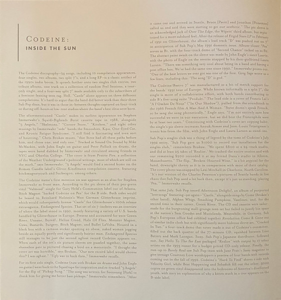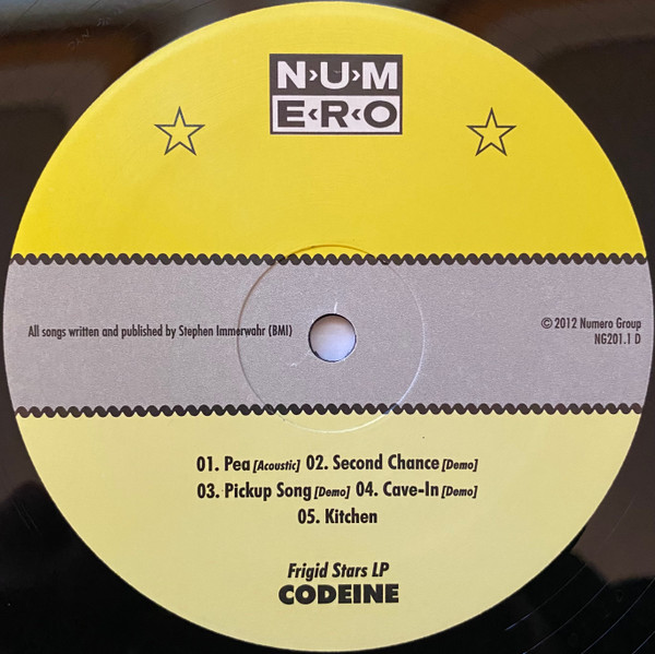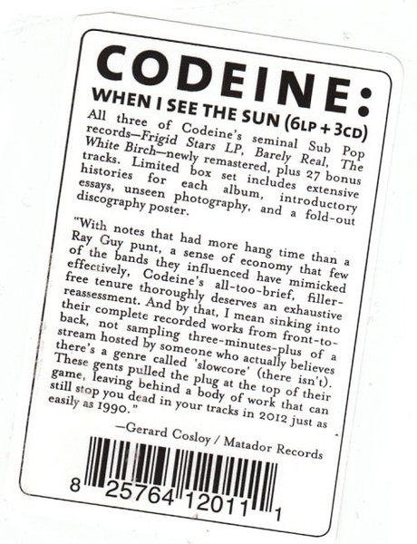 art direction Henry H. Owings cover [original jacket frigid stars lp], design [frigid stars lp] Tammi Colichio cover [original jacket the white birch], design [the white birch] Jeff Kleinsmith design [package] The Numero Group engineer Mike McMackin interviewer [interview conducted by] Mike McGonigal lacquer cut by [uncredited] Josh Bonati liner notes Judson Picco liner notes Ken Shipley liner notes [barely real] Alan Light liner notes [frigid stars lp] Jonathan Poneman liner notes [sticker] Gerard Cosloy liner notes [the white birch] Mike McGonigal mastered by Jeff Lipton mastered by [assistant] Maria Rice tracks a1 to cd2-15 musician [codeine] Chris Brokaw tracks i1 to cd3-17 musician [codeine] Doug Scharin musician [codeine] John Engle musician [codeine] Stephen Immerwahr photography by Charles Peterson photography by John Engle photography by Ken Brown photography by Laura Larson photography by Lexi Mitchell photography by Manfred Rahs photography by Mike Galinsky photography by Moni Kellermann producer [original recordings] Codeine producer [original recordings] Mike McMackin recorded by Mike McMackin reissue producer Ken Shipley reissue producer Rob Sevier research, compiled by Ken Shipley tracks a1 to a4, b1 to d5, cd1-1 to cd1-4, cd1-6 to cd1-20, e1 to f2, g1 to h5, cd2-1 to cd2-4, cd2-6 to cd2-15, i1 to k2, k4, l2 to l4, cd3-1 to cd3-11, cd3-13, cd3-15 to cd3-17 written-by Stephen Immerwahr Licensed From Sub Pop Licensed From Codeine Phonographic Copyright (p) Sub Pop Records Copyright (c) Numero Group Published By Stephen Immerwahr Published By Seam Songs Published By Emexco Music Published By Pale Pachyderm Publishing Published By Copyright Control Published By Universal Music Publishing Group Mastered At Peerless Mastering Lacquer Cut At Bonati Mastering Pressed By United Record Pressing Packaged in an outer slipcase box with each album and booklet in its own oversized gatefold sleeve containing a pocket for the corresponding CD. Originally released in a run of 1000 copies, though an additional run of an undisclosed quantity was later pressed. These copies are identical but do not contain the discography poster or sticker present in the first 1000.