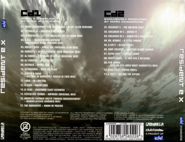 artwork Michael Kowalkowski concept by, executive-producer [realized by], presenter Marc Acardipane tracks 2-01 to 2-11 dj mix [uncredited], producer [exclusively produced by] Marc Acardipane tracks 1-01 to 1-17 dj mix, compiled by Marc Acardipane Manufactured By Optimal Media Production Housed in a slim double jewel case with transparent fliptray. Release title appears as Marc Acardipane presents Resident E - Episode X on front cover, Resident E X on spines and Resident E - Episode X on CDs.