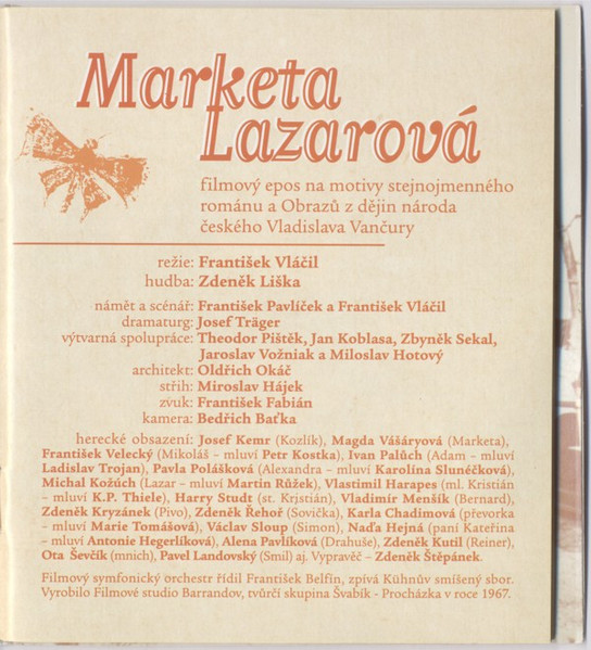 Uncredited parts and complementary notes taken from the following books (in Czech): Gajdošík, Petr (ed.): Marketa Lazarová. Studie a dokumenty (Casablanca, 2008, ISBN 978-80-87292-00-6), p. 107–153; Matzner, Antonín - Pilka, Jiří: Česká filmová hudba (Dauphin, 2002, ISBN 80-7272-013-9), p. 295. ___