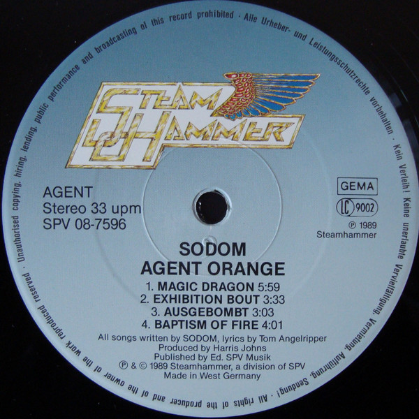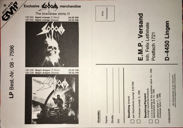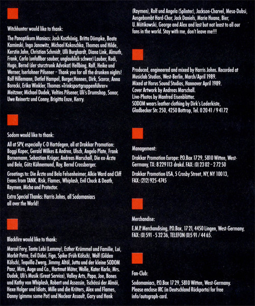 bass, voice Tom Angelripper cover, artwork Andreas Marschall drums, percussion, backing vocals Chris Witchhunter guitar, backing vocals Frank Blackfire lyrics by Tom Angelripper management Drakkar Promotion management Drakkar USA merchandising [merchandise] EMP photography by [live-photos by] Manfred Eisenblätter producer, engineer, mixed by Harris Johns written-by Sodom Record Company SPV Phonographic Copyright (p) Steamhammer Copyright (c) Steamhammer Recorded At Music Lab Berlin Mixed At Horus Sound Studio Published By Edition SPV Musik Distributed By SPV GmbH Distributed By Disctrade Distributed By Echo (29) Distributed By Bertus Distributed By Play It Again Sam Distributed By New Rose Distributed By Donosti Distributed By FM Records Distributed By APT (2) Distributed By Krone Music Distributed By Blitz (15) Distributed By Polarvox Pressed By Sonopress Inner sleeve with lyrics and credits. EMP merchandise insert (some copies).