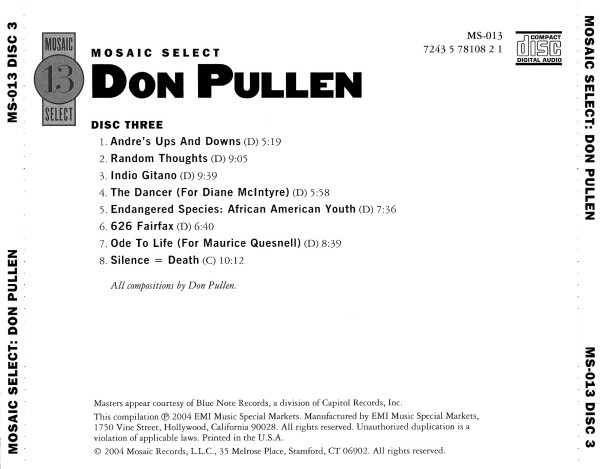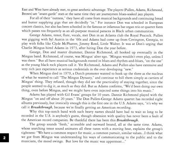 tracks 1-1 to 1-9, 2-1 to 2-3 bass Cameron Brown tracks 2-4 to 2-9, 3-8 bass Gary Peacock tracks 3-1 to 3-7 bass James Genus design [direction] Richard Mantel design [production] Inkwell, Inc. tracks 2-4 to 2-9, 3-8 drums Anthony Williams tracks 1-1 to 1-9, 2-1 to 2-3 drums Dannie Richmond tracks 3-1 to 3-7 drums Lewis Nash tracks 2-4 to 3-8 engineer [recording] David Baker tracks 1-1 to 2-3 engineer [recording] Mike Moran executive-producer JoAnne Jimenez mastered by Kurt Lundvall piano, composed by [unless otherwise noted] Don Pullen producer, reissue producer Michael Cuscuna tracks 1-1 to 1-9, 2-1 to 2-3 tenor saxophone George Adams Manufactured By EMI Music Special Markets Phonographic Copyright (p) EMI Music Special Markets Copyright (c) Mosaic Records, L.L.C. Recorded At RCA Studio A Recorded At RCA Studio C Recorded At A&R Studios #1-1 to 1-6 Recorded at RCA Studio A, New York City on April 30, 1986. All tunes except “The Necessary Blues” originally issued on BREAKTHROUGH by the Don Pullen-George Adams Quartet (Blue Note BT-85122). All tunes issued on the CD version of the album (B2-46314).