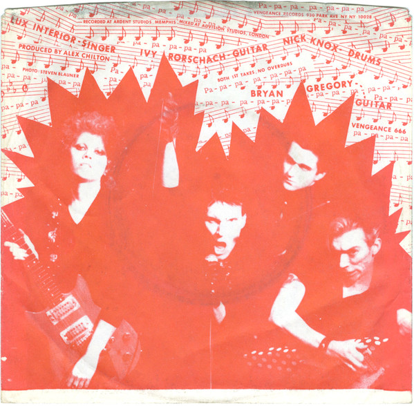 drums Nick Knox guitar Bryan Gregory guitar Ivy Rorschach photography by [photo] Steven Blauner producer Alex Chilton vocals [singer] Lux Interior Pressed By Goldisc Recording Products, Inc. Pressed By Goldisc Recording Products, Inc. Published By Long Music Published By Starfire Music Mixed At Advision Studios Recorded At Ardent Studios There was only one pressing of this 45 with the same matrix numbers, but there were two different sleeves (this one with orange / red back sleeve and a different one with purple back sleeve). Robert Mache printed the sleeves for this single (and for Human Fly) and he confirmed that there was only one pressing of this vinyl with two different back covers released at the same time. The different color back sleeves were done for variation (the same as many of the early band flyers which were printed on more than one color of paper or with more than one color of ink).
