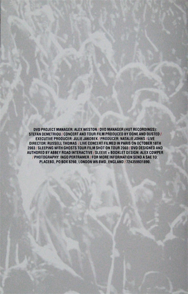 design [dvd designed by], authoring [dvd authored by] Abbey Road Interactive design [sleeve + booklet design] Alex Cowper executive-producer Julie Jakobek film director [live director] Russell Thomas film producer [concert and tour film produced by] Done And Dusted film producer [producer] Natalie Johns management Riverman performer Brian Molko performer Stefan Olsdal performer Steve Hewitt photography by Ingo Pertramer product manager [dvd manager (hut recordings)] Stefan Demetriou project manager [dvd project manager] Alex Weston Phonographic Copyright (p) Virgin Records Ltd. Copyright (c) Virgin Records Ltd. Copyright (c) EMI Records Ltd. Recorded At Palais Omnisports Paris-Bercy Filmed At Palais Omnisports Paris-Bercy Pressed By EMI Uden Live concert filmed in Paris on October 18th, 2003 Sleeping With Ghosts Tour Film shot on tour 2003