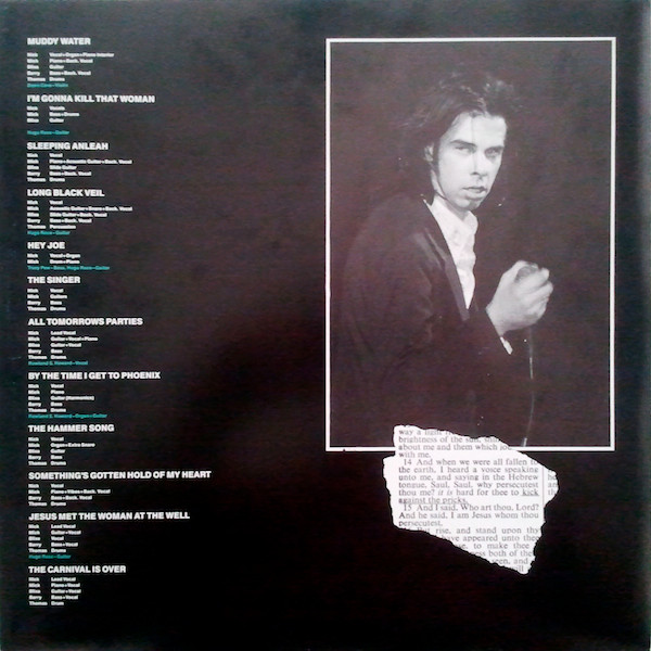 arranged by [string arrangements] Mick Harvey tracks a1, a3, a4, b4 backing vocals [back. vocal] Barry Adamson tracks a1, a3, a4, b4 backing vocals [back. vocal] Mick Harvey tracks a1, a3, a4, a6 to b6 bass Barry Adamson tracks a2, a5 drums Mick Harvey tracks a1, a3, a6 to b6 drums Thomas Wydler engineer [all backing tracks] Tony Cohen tracks a1, a2, b1, b3, b6 guitar Blixa Bargeld tracks a2, a4, a5, b5 guitar Hugo Race tracks a1 to a6 lacquer cut by Tim Young tracks b1 to b6 lacquer cut by Tim Young mixed by [assistant] Sven Taits mixed by [assistant] Tom Frederikse mixed by [engineer] Flood mixed by [with] Blixa Bargeld mixed by [with] Mick Harvey mixed by [with] Nick Cave mixed by [with] Thomas Wydler photography by [blixa & thomas, inner sleeve photo] Petra Gall photography by [front cover photo] Peter Milne photography by [mick & barry] Chris Nash tracks a1, a3, a5, b1, b2, b4, b6 piano Mick Harvey producer Nick Cave & The Bad Seeds sleeve Assorted iMaGes sleeve Nick Cave & The Bad Seeds strings [string arrangements played by] Berliner Kaffeehausmusik Ensemble tracks a1 to a6, b2 to b4 vocals Nick Cave Record Company Mute Records Phonographic Copyright (p) Mute Records Copyright (c) Mute Records Pressed By MPO Published By Cayman Music Inc. Published By Boogie One Music Published By Acuff Rose Music Ltd. Published By Southern Music Co. Ltd. Published By Carlin Music Corp. Published By RCA Music Ltd. Published By Chrysalis Music Published By Dick James Music Published By Copyright Control Published By Chappell Music Ltd. Engineered At AAV Mixed At Hansa Tonstudios Title is intentionally written on the front and back covers as Kicking Against The Pricks, as it is a quote from the bible (Acts 26:14).