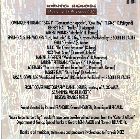 Track 15 is an unmentioned track. 'Music To Be Murdered By' wouldn't have been possible without a grant from the Cultural Affairs Department Of Nancy. Special thanks to Gérard Benhamou and Florence Delanchy.