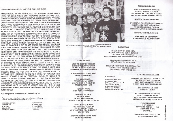 tracks a1 to a4 bass Marcelo Da Silva tracks b1 to b3 bass [drill], voice [voices] Jan Frederickx tracks b1 to b3 drums [sticks], noises Burt Beyens tracks a1 to a4 drums, voice Claudinei Vieira tracks a1 to a4 guitar Mendigo tracks b1 to b3 guitar [chainsaw], voice [voices] Steve Houtmeyers layout [rot insert] Denoir Cibié tracks a1 to a4 voice Marcelo R. Batista Rot recorded on 10, 11th of July '94. Agathocles tracks B1 & B2 were recorded and mixed at Soundshape Studios in Arendonk Belgium on 17 and 18 December 1994. Track B3 was recorded live during a gig in the Juha, Gunzburg, Germany on 15 April 1994.
