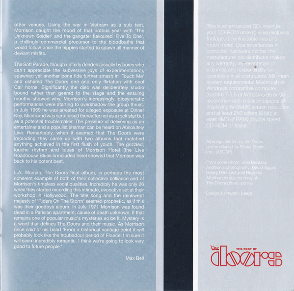 design, artwork Blade drums John Densmore guitar Robby Krieger keyboards Ray Manzarek liner notes Max Bell management Danny Sugerman photography by [additional] David Sygall photography by [additional] Henry Diltz photography by [additional] Joel Brodsky photography by [front cover photo] Joel Brodsky tracks 1-14, 2-1 producer Bruce Botnick tracks 1-1 to 1-13, 1-15 to 1-19, 2-2 to 2-18 producer Paul A. Rothchild producer The Doors remastered by Bruce Botnick vocals Jim Morrison written-by The Doors Manufactured By Warner Music Manufacturing Europe Phonographic Copyright (p) Elektra Entertainment Group Phonographic Copyright (p) WEA International Inc. Copyright (c) Elektra Entertainment Group Copyright (c) WEA International Inc. Published By Doors Music Inc. Pressed By WMME Alsdorf 'Digitally Remastered by Bruce Botnick'.