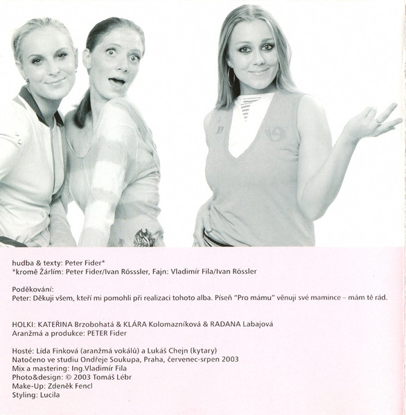 arranged by Peter Fider guest, arranged by [vokálů] Lída Finková guest, guitar Lukáš Chejn tracks 4, 8 lyrics by Ivan Rössler tracks 1 to 3, 5 to 7, 9, 10 lyrics by Peter Fider mixed by, mastered by Vladimír Fila tracks 1 to 7, 9, 10 music by Peter Fider tracks 8 music by Vladimír Fila performer Holki photography by, design Tomáš Lébr vocals Kateřina Brzobohatá vocals Klára vocals Radana Phonographic Copyright (p) EMI Czech Republic s.r.o. Copyright (c) EMI Czech Republic s.r.o. Marketed By EMI Distributed By EMI Pressed By GZ Digital Media Recorded At Studio Ondřeje Soukupa Natočeno ve studiu Ondřeje Soukupa, Praha, červenec-říjen 2003