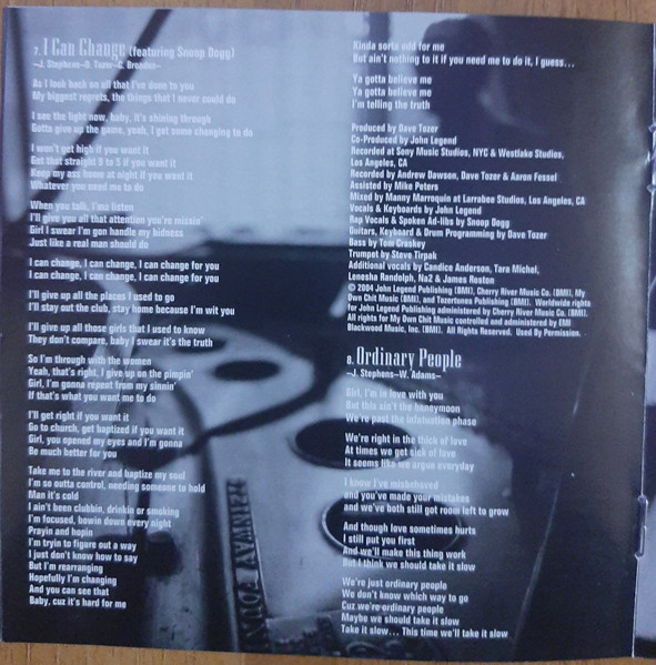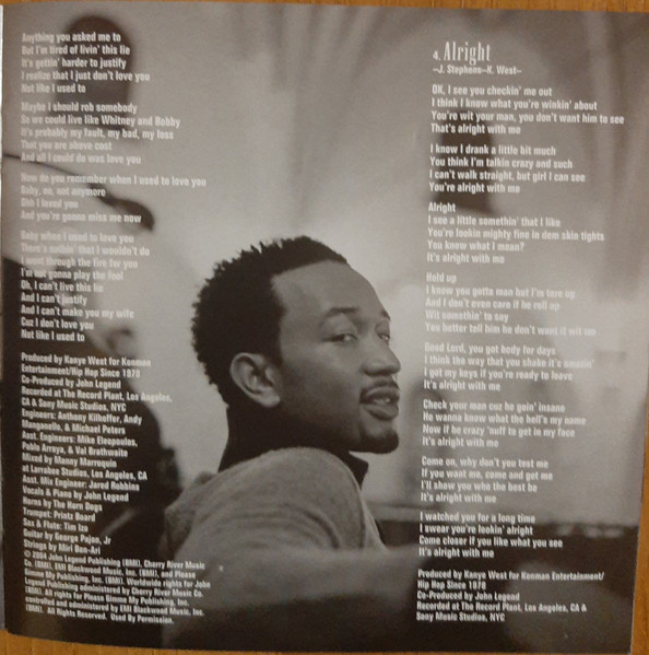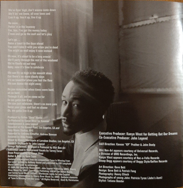 a&r [direction] John Doelp a&r [direction] Kawan Prather art direction David Bett design David Bett design Patrick Fong executive-producer Kanye West executive-producer [co-executive] John Legend management DAS Communications photography by Danny Clinch photography by [young john] Patricia Tyree stylist Tatiana Beedar Copyright (c) Sony Music Entertainment Phonographic Copyright (p) Sony Music Entertainment Phonographic Copyright (p) Getting Out Our Dreams Track 1, 2, 3, 4, 6, 8, 10, 11, 14 recorded at [l304319] & [l295805] and mixed at [l266862] Track 5 recorded at [l364501] and mixed at [l266862] Track 7 recorded at [l295805] & [l268145] and mixed at [l266862] Track 9 recorded at [l304319] & [l539220] and mixed at [l266862] Track 12 recorded at [l304319] and mixed at [l266862] Track 13 recorded at [l359950]; [l295805] & [l304319] and mixed at [l266862]
