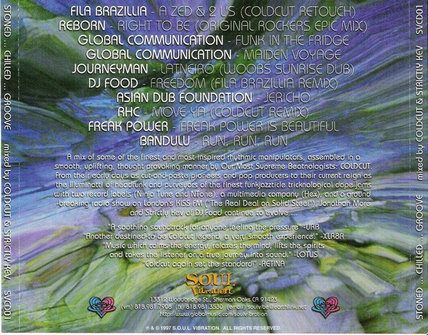 art direction [artwork direction by] Freddy Be art direction [artwork direction by] Professor Smith compiled by, concept by [conceptualized by], curated by [uncredited], executive producer [uncredited] Freddy Be dj mix [mixed by] Coldcut dj mix [mixed by] Jonathan More dj mix [mixed by] Strictly Kev design Professor Smith legal [legal assistance] Dean Serwin liner notes Robert Shea photography by Dr. Bliss photography by Freddy Be photography by Professor Smith Phonographic Copyright (p) S.O.U.L. Vibration Copyright (c) S.O.U.L. Vibration Copyright (c) Pork Recordings Phonographic Copyright (p) Island Records Copyright (c) Island Records Phonographic Copyright (p) Dedicated Copyright (c) Dedicated Phonographic Copyright (p) Ntone Copyright (c) Ntone Phonographic Copyright (p) Ninja Tune Copyright (c) Ninja Tune Phonographic Copyright (p) Nation Records Ltd. Copyright (c) Nation Records Ltd. Published By QFM Publishing Published By Warner/Chappell Copyright (c) Rising High Records Phonographic Copyright (p) Creation Records Copyright (c) Creation Records Mastered At Mondophonix Pressed By USMD-CA 7: Published by QMF/Warner Chappell