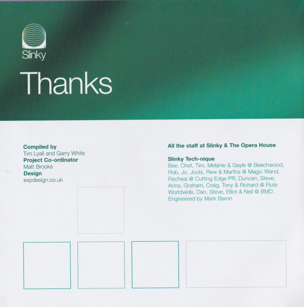 tracks 2-01 to 2-18 dj mix Garry White tracks 1-01 to 1-18 dj mix Tim Lyall Record Company Slinky Music Ltd. Phonographic Copyright (p) Beechwood Music Ltd. Copyright (c) Beechwood Music Ltd. No remix name given for 1-14 although Nalin & Kane is credited for the remix in the booklet. 1-17 incorrectly listed as Original Mix. No mention of who mixed which disc.