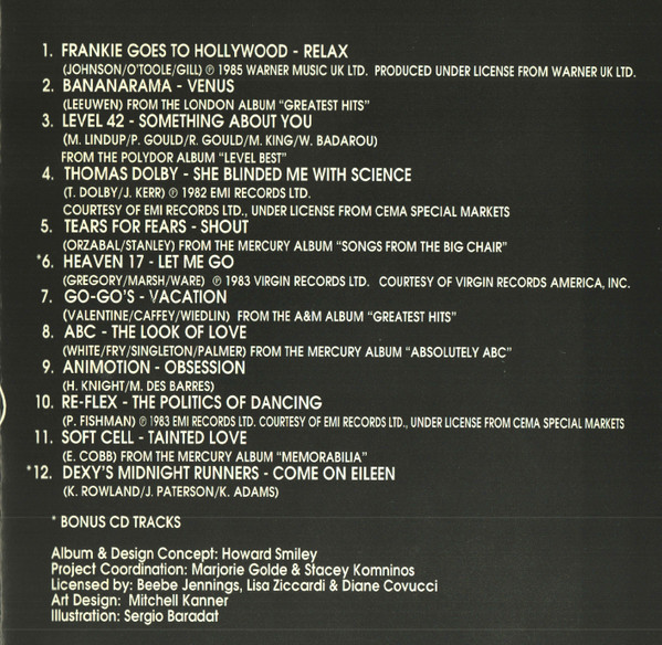 compilation producer, concept by, design Howard Smiley coordinator Marjorie Golde coordinator Stacey Komninos design Mitchell Kanner illustration Sergio Baradat Pressed By PMDC, USA Copyright (c) PolyGram Records, Inc. Phonographic Copyright (p) PolyGram Records, Inc. Manufactured By PolyGram Special Markets Marketed By PolyGram Special Markets Track 1 is the Classic 1993 Version from Relax. Track 3 is an edit of the Shep Pettibone Remix. Track 8 is the 1990 Mix. Track 9 is an edit of the Dance Mix. Track 11 is Tainted Love '91 (The Mendelsohn Remix). 6 and 12 are bonus CD tracks.