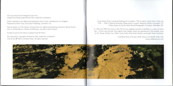 tracks 1-7 to 1-10 cello Erika Duke-Kirkpatrick tracks 3-5, 3-6 clarinet Marty Walker tracks 3-7 to 3-10 effects [cascading echo system] Daniel Lentz tracks 3-5, 3-6 electric guitar [prepared electric guitar], voice Rick Cox tracks 3-1 to 3-4 pedal steel guitar, dobro [12-string dobro] Chas Smith tracks 1-7 to 1-10 piano Duncan Goodrich tracks 3-1 to 3-4 producer Chas Smith tracks 3-10 producer Daniel Lentz producer Jim Fox tracks 1-7 to 1-10 producer Michael Jon Fink tracks 2-2, 2-3 producer Read Miller tracks 3-5, 3-6 producer Rick Cox tracks 3-10 producer [production assistance] Eugene Bowen tracks 1-1 to 1-6 rattle [gourd rattles] Peter Garland tracks 3.-1 to 3-4 recorded by Chas Smith tracks 3-7 to 3-8 recorded by Daniel Protheroe tracks 3-10 recorded by David Porter tracks 2-2, 2-3, 3-5, 3-6 recorded by Marty Walker tracks 1-7 to 1-10 recorded by Michael Zellner tracks 3-10 recorded by Richard Bosworth tracks 1-1 to 1-6 recorded by Robert Shumaker tracks 1-1 to 1-6 violin John Tenney tracks 1-1 to 1-6 violin Ronald Erickson tracks 2-2, 2-3 voice Janyce Collins tracks 2-2, 2-3 voice Read Miller tracks 2-2 voice Rick Cox tracks 3-7 to 3-9 voice, keyboards Arlene Dunlap tracks 3-7 to 3-9 voice, keyboards Garry Eister tracks 3-7 to 3-9 voice, keyboards Joanne Christensen tracks 3-7 to 3-9 voice, keyboards Richard Dunlap tracks 3-10 voice, piano Arlene Dunlap The music on this CD set was originally issued by Cold Blue as a series of seven 10-inch EPs in 1982-83. The series featured: - Peter Garland - Matachin Dances (1981) - Michael Jon Fink - untitled (1982) - Barney Childs - Clay Music (1981) - Read Miller - Mile Zero Hotel (1981) - Chas Smith - After/Santa Fe... (1982) - Rick Cox - These Things Stop Breathing (1981) - Daniel Lentz - After Images (1980)