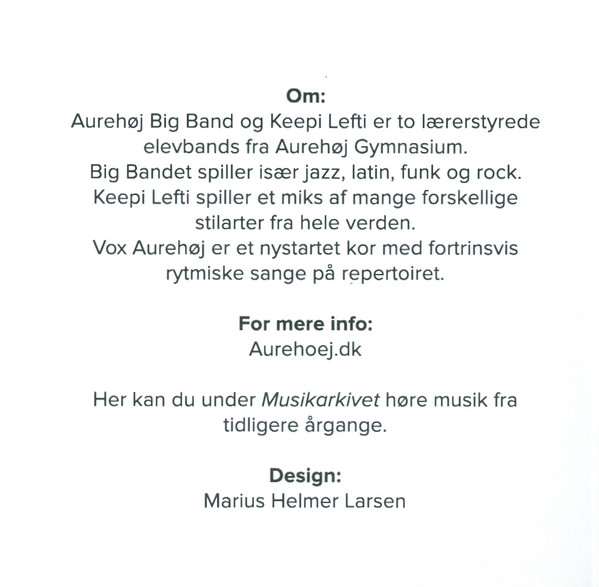 design Marius Helmer Larsen tracks 1 to 9 musician [aurehøj big band], bass Emil Blom-Hansen tracks 1 to 9 musician [aurehøj big band], drums Oskar Dinesen tracks 1 to 9 musician [aurehøj big band], guitar Simon Klie tracks 1 to 9 musician [aurehøj big band], piano Karl D. Madsen tracks 1 to 9 musician [aurehøj big band], saxophone Anton M. Kronborg tracks 1 to 9 musician [aurehøj big band], saxophone Asger Forman tracks 1 to 9 musician [aurehøj big band], saxophone Daniel Hilden Honorè tracks 1 to 9 musician [aurehøj big band], saxophone Liv K. Stranddorf tracks 1 to 9 musician [aurehøj big band], saxophone Marie D. Stets tracks 1 to 9 musician [aurehøj big band], trombone Emma Jarnbye tracks 1 to 9 musician [aurehøj big band], trombone Joakim J. Krigslund tracks 1 to 9 musician [aurehøj big band], trombone Nils H. Peschcke-Køedt tracks 1 to 9 musician [aurehøj big band], trombone Peter J. Darket tracks 1 to 9 musician [aurehøj big band], trombone Tobias Bessing tracks 1 to 9 musician [aurehøj big band], trumpet Agnes Schloss-Pedersen tracks 1 to 9 musician [aurehøj big band], trumpet Aia Jacobsen tracks 1 to 9 musician [aurehøj big band], trumpet Aske F. Musaeus tracks 1 to 9 musician [aurehøj big band], trumpet Christian R. Pedersen tracks 1 to 9 musician [aurehøj big band], trumpet Niels d.F. Olivarius tracks 1 to 9 musician [aurehøj big band], vocals Christine Grønholdt tracks 1 to 9 musician [aurehøj big band], vocals Clara Boysen tracks 1 to 9 musician [aurehøj big band], vocals Louise Mc. Jacobsen tracks 1 to 9 musician [aurehøj big band], vocals Nugga N. Jespersen tracks 10 to 14 musician [keepi lefti], bass Frederik L. Mikkelsen tracks 10 to 14 musician [keepi lefti], drums Marius H. Larsen tracks 10 to 14 musician [keepi lefti], guitar Jonas Pedersen tracks 10 to 14 musician [keepi lefti], guitar Matias Milling tracks 10 to 14 musician [keepi lefti], keyboards Andrea O. Koch tracks 10 to 14 musician [keepi lefti], percussion Andreas K.O. Olesen tracks 10 to 14 musician [keepi lefti], saxophone Clara L.A. Juul tracks 10 to 14 musician [keepi lefti], saxophone Emil K. Pedersen tracks 10 to 14 musician [keepi lefti], saxophone Frederik E. Bang tracks 10 to 14 musician [keepi lefti], saxophone Helena M. Bardenfleth tracks 10 to 14 musician [keepi lefti], trumpet Carlo J.B. Lauritsen tracks 10 to 14 musician [keepi lefti], trumpet David L. Ivens tracks 10 to 14 musician [keepi lefti], vocals Emilie C. Lindhardsen tracks 10 to 14 musician [keepi lefti], vocals Lea Pelvig tracks 10 to 14 musician [keepi lefti], vocals Oskar C.B. Lemke tracks 10 to 14 musician [keepi lefti], vocals Sara Dømler tracks 1 to 9 recorded by [aurehøj big band] Bjarne Brems tracks 10 to 14 recorded by [keepi lefti] Christian Alex Petersen tracks 10 to 14 recorded by [keepi lefti] Freddy Albrektsen Aurehøj Big Band and Keepi Lefti are two teacher-driven high school bands from Aurehøj Gymnasium.