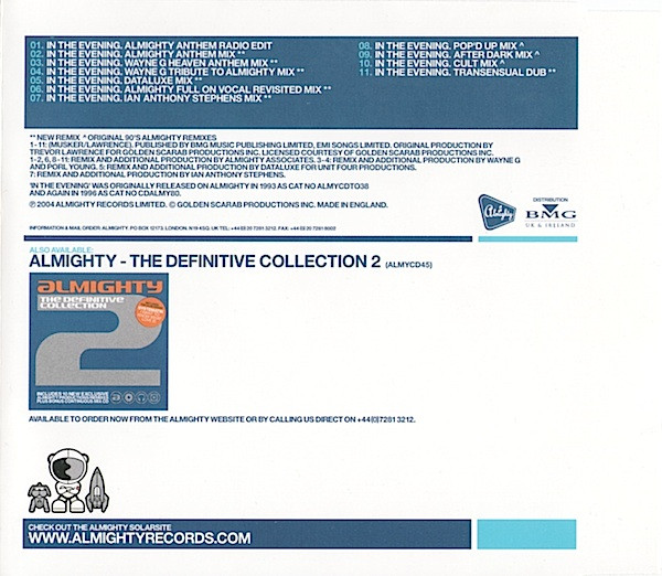 'In The Evening' was originally released on Almighty in 1993 as Cat No ALMYCDT038 and again in 1996 as Cat No CDALMY80.