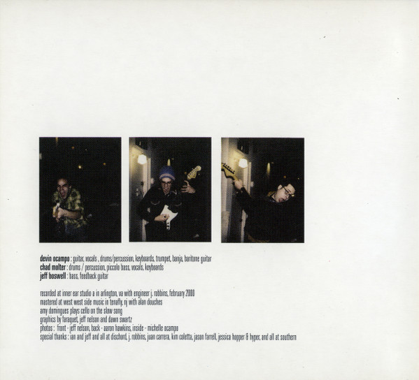 bass, guitar [feedback guitar] Jeff Boswell drums, percussion, piccolo bass guitar [piccolo bass], vocals, keyboards Chad Molter engineer [with] J. Robbins graphics Dawn Swartz graphics Faraquet graphics Jeff Nelson guitar, vocals, drums, percussion, keyboards, trumpet, banjo [banja], baritone guitar Devin Ocampo mastered by [with] Alan Douches photography by [back] Aaron Hawkins photography by [front] Jeff Nelson photography by [inside] Michelle Ocampo Recorded At Inner Ear Studios Mastered At West West Side Music Made By MPO Recorded at Inner Ear Studio A in Arlington, VA, February 2000 Mastered at West West Side Music in Tenafly, NJ