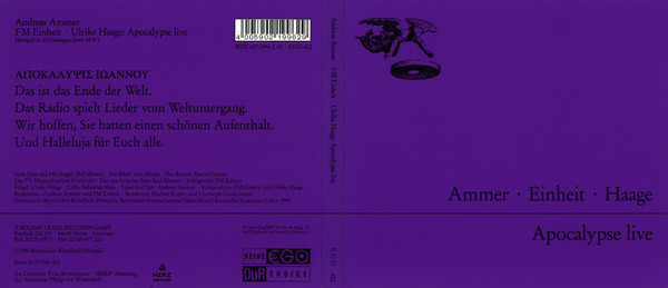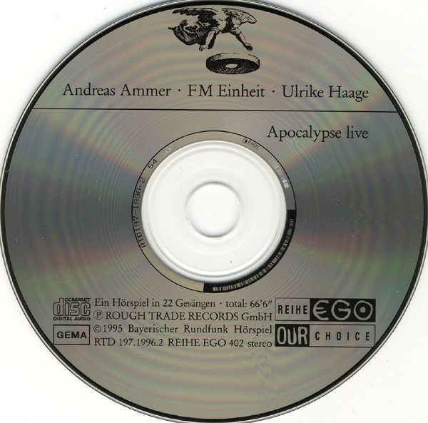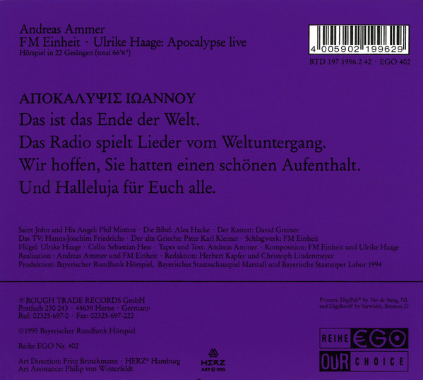art direction Fritz Jan Thaddaeus Brinckmann art direction Herz° Hamburg artwork [art assistance] Philip Von Winterfeldt cello Sebastian Hess composed by Ulrike Haage effects [sound effects], composed by, percussion, performer [mamor, wire] F.M. Einheit effects [sound effects], lyrics by Andreas Ammer vocals, voice actor [die bibel], guitar Alexander Hacke voice actor [das tv] Hanns-Joachim Friedrichs voice actor [der alte grieche] Pater Karl Kleiner voice actor [der kastrat] David Greiner voice actor [saint john and his angel] Phil Minton Phonographic Copyright (p) Rough Trade Records GmbH Copyright (c) Bayerischer Rundfunk Hörspiel Glass Mastered At DADC Austria Subtitle (inner flap): Hörspiel nach der biblischen Offenbarung des Johannes • Aufgenommen live am 14. Oktober 1994 im Münchener Marstall. (Radioplay performed live on October 14, 1994, Munich Marstall.) Subtitle (back, cd): Hörspiel in 22 Gesängen (total 66'6'').