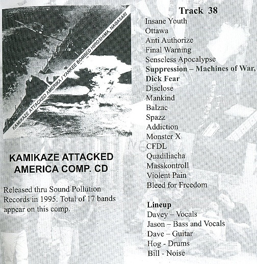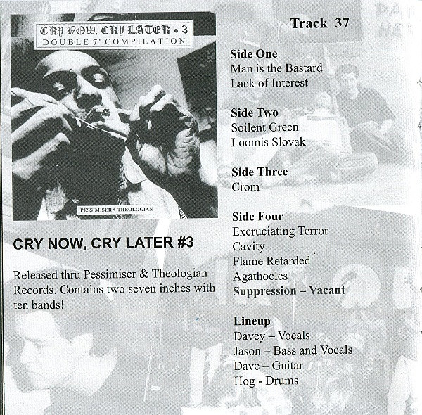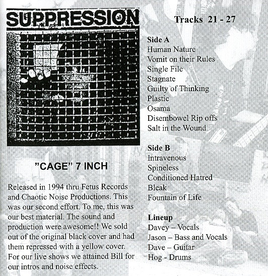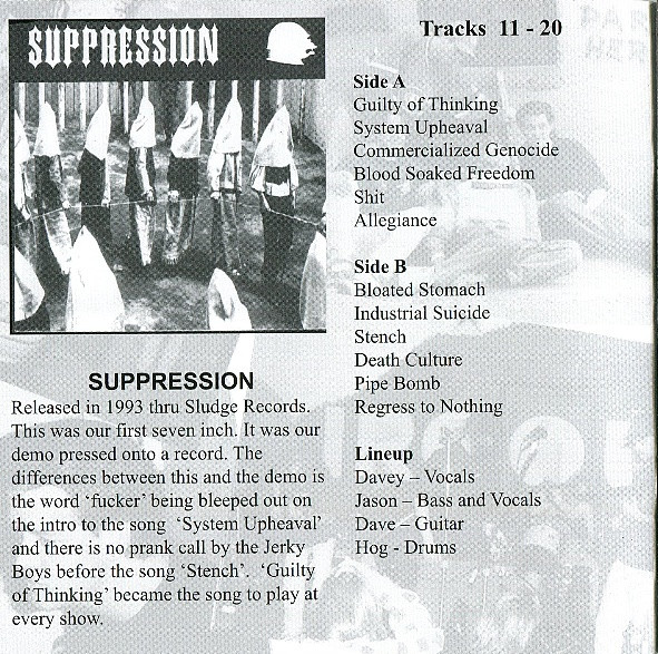Tracks 1-10. 92 Rehearsal/Demo. This tape was released sometime in 1991-1992. Tracks 11-20. SUPPRESSION 1993 Demo. Self released in 1993. 7 Inch released in 1993 thru Sludge Records. Tracks 21-27. Cage 7 Inch. Released in 1994 thru Fetus Records and Chaotic Noise Productions. Tracks 28-32. Split with GRIEF Terrorism of Thought, Terrorism of Sound. Released thru Bovine Records in 1995. Tracks 33-36. Split with DESPISE YOU Mechanized Flesh. Released thru Slap A Ham Records. Track 37. Cry Now, Cry Later #3. Released thru Pessimiser & Theologian Records. Track 38. Kamikaze Attacked America Comp. CD. Released thru Sound Pollution Records in 1995. Tracks 39-50. Split with CRIPPLE BASTARDS. Released in 1996 thru Bovine Records.