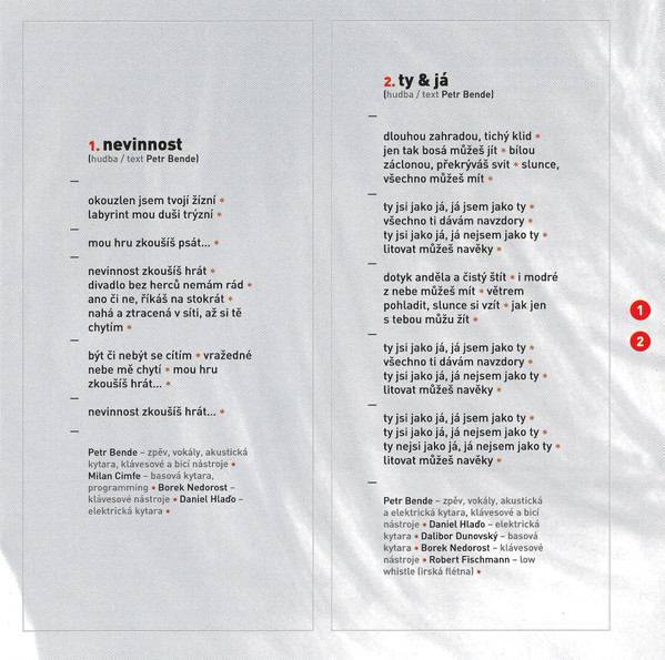 co-producer Brothers Records co-producer D.A.N. Production cover, design Pavel Lukšan mastered by Pavel Karlík photography by Radek Kaftan tracks 13 post production Milan Cimfe tracks 13 post production Petr Bende tracks 13 producer [hudební produkce] Juraj Kupec tracks 1 to 12, 14 producer [hudební produkce] Milan Cimfe Distributed By Sony BMG Music Entertainment Phonographic Copyright (p) Sony BMG Music Entertainment (Czech Republic) s.r.o. Copyright (c) Sony BMG Music Entertainment (Czech Republic) s.r.o. Pressed By Sonopress Arvato Recorded At Studio Musicbox Recorded At Ebony Studio (2) Recorded At Sono Studio Mixed At Sono Studio Mastered At Sono Studio Made in the EU. Barcode: 8 28767 15472 5 (Text) Barcode: 828767154725 (Scanned) Label Code: LC 00116 Matrix / Runout: [Sonopress Arvato Logo] 51693689/82876715472 21 Mastering SID Code: IFPI LP 73 Mould SID Code: IFPI 0795 Rights Society: OSA Rights Society: BIEM