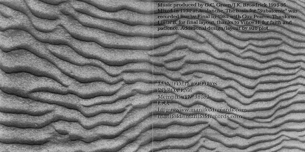 design, layout [additional design/layout] Sub Plot layout [final layout] Linus Booth producer [music produced by] G.C. Green producer [music produced by] Justin K Broadrick Mixed At Avalanche (4) Music produced 1993-95. Mixed in 1996 at Avalanche. The basis for Subatomic was recorded live by Final in 1985 with Guy Pearce.