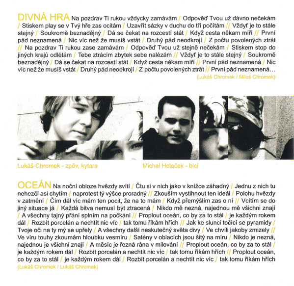 bass guitar Jan Škaloud cover, design Martin Mišík drums Michal Holeček keyboards, vocals Žaneta Rychnovská management, booking Martina Tůmová mastered by Andrej Lažo mixed by [studio ci 5] Jiří "Kulich" Novotný mixed by [studio citron, ostrava] Jiří "Kulich" Novotný producer František Táborský recorded by [sun studio] David Mařík vocals, guitar Daniel Franc vocals, guitar Lukáš Chromek Phonographic Copyright (p) Sony Music Entertainment (Czech Republic) s.r.o. Copyright (c) Sony Music Entertainment (Czech Republic) s.r.o. Recorded At SUN STUDIO Tuchoměřice Recorded At Studio CI 5 Mixed At Studio CI 5 Mixed At Studio Citron Mastered At Sono Studio Glass Mastered At Sonopress Arvato Made in cooperation with Richard Liegert & Bon Art Production, spol, s.r.o. Clothing was provided by H & M and Represent. Barcode: 5 099751 861829 (Text) Barcode: 5099751861829 (Scanned) Label Code: LC 0199 Matrix / Runout: [Sonopress Arvato] 51476196/518618-2 21 Mastering SID Code: IFPI LP 50 Mould SID Code: IFPI O715 Rights Society: OSA BIEM