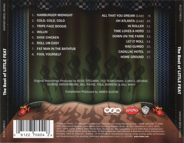 compilation producer James Austin producer [original recordings] Bill Payne producer [original recordings] Bill Wray producer [original recordings] George Massenburg producer [original recordings] Lowell George producer [original recordings] Paul Barrere producer [original recordings] Russ Titelman producer [original recordings] Ted Templeman product manager Matt Abels remastered by Bill Inglot remastered by Dan Hersch Phonographic Copyright (p) Rhino Entertainment Company Copyright (c) Rhino Entertainment Company Phonographic Copyright (p) Warner Bros. Inc. Phonographic Copyright (p) Zoo Entertainment Licensed To Zomba Recording Corporation Phonographic Copyright (p) CMC International Records Licensed To Sanctuary Records Group (p) 1972, 1973, 1977, 1979, 1988 & 1990 Warner Bros Records, Inc. This Compilation (c) & (p) 2006 Rhino Entertainment Company, a Warner Music Group. (p) 1995 Zoo Entertainment, Licensed from Zomba Recording Corp. (p) 1998 CMC International Records, under Licensed from Sanctuary Records Group. Barcode: 0 8122 70804 2 6 Matrix / Runout: CD 812270804-2 V01 Rights Society: GEMA/BIEM Label Code: LC 02982